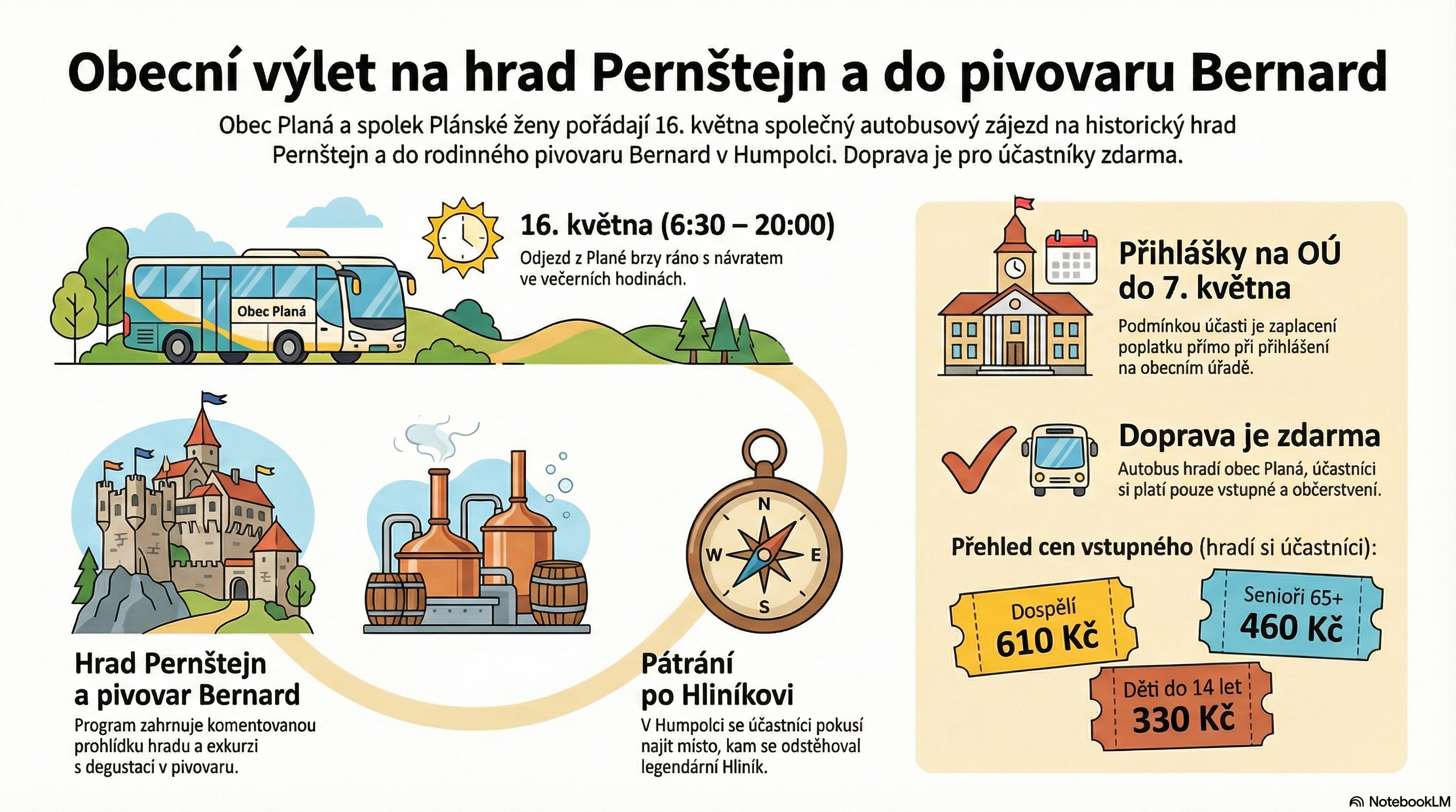 Obec Planá a spolek Plánské ženy pořádají 16. května 2026 společný autobusový zájezd na historický hrad Pernštejn a do rodinného pivovaru Bernard v Humpolci. Doprava je pro účastníky zdarma.